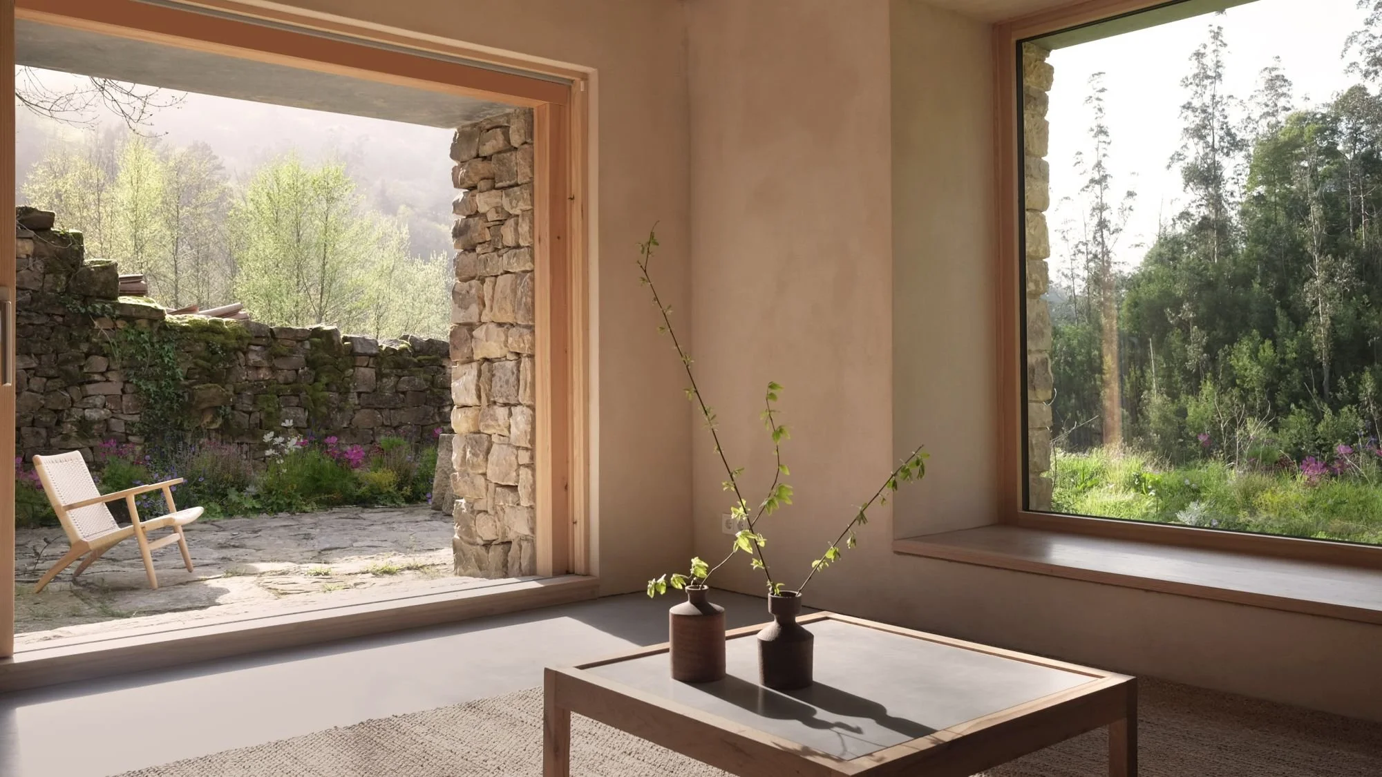 Los dos dormitorios y el espacio de estar han sido diseñados como refugios sensoriales donde la simplicidad de líneas y los materiales naturales crean ambientes de serenidad, con vistas cuidadosamente enmarcadas del paisaje circundante.