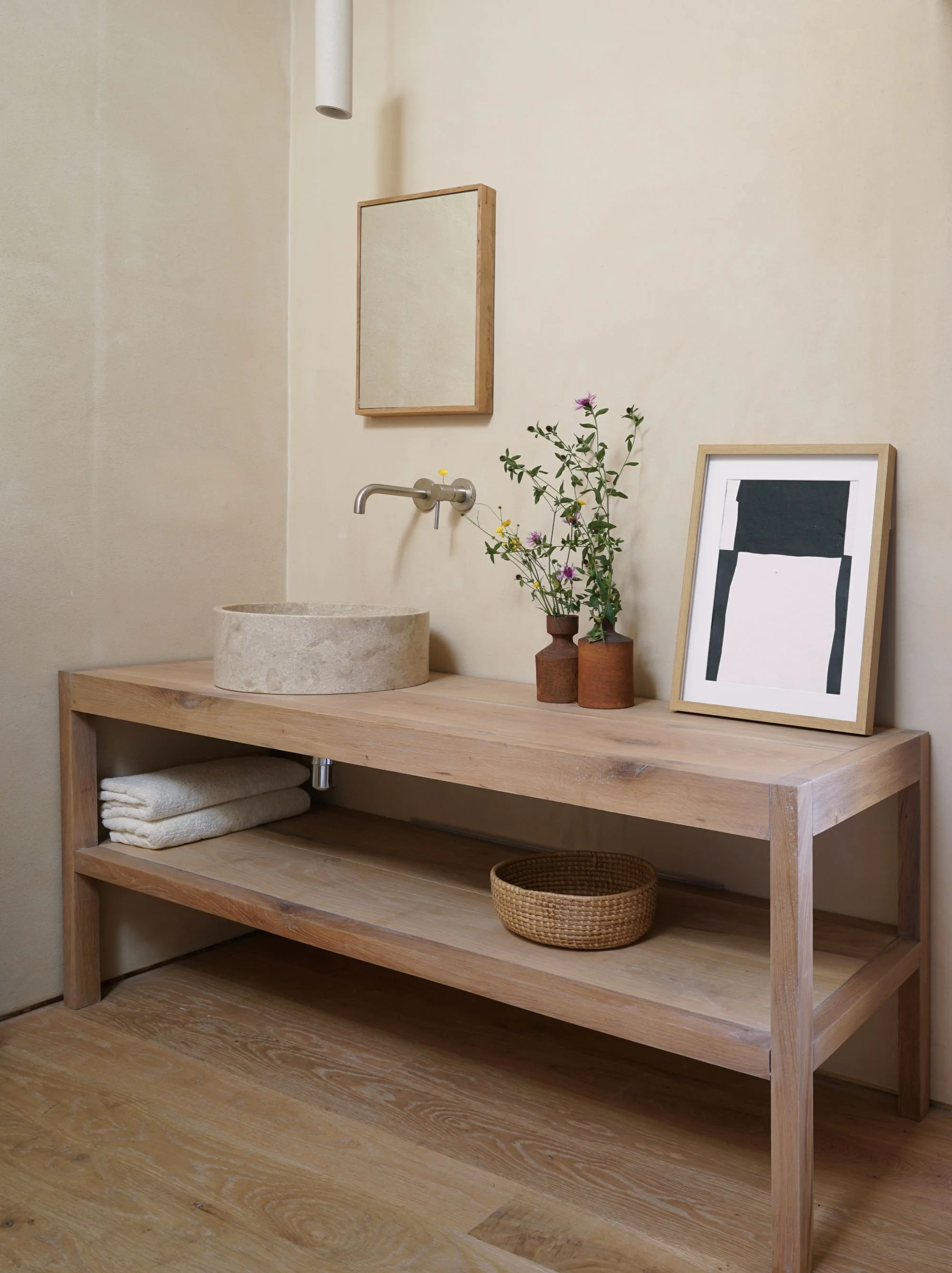 Two full bathrooms and a toilet that continue the essential language of the house. Mineral finishes, soft textures, and a sober aesthetic turn the daily ritual into a sensory experience.